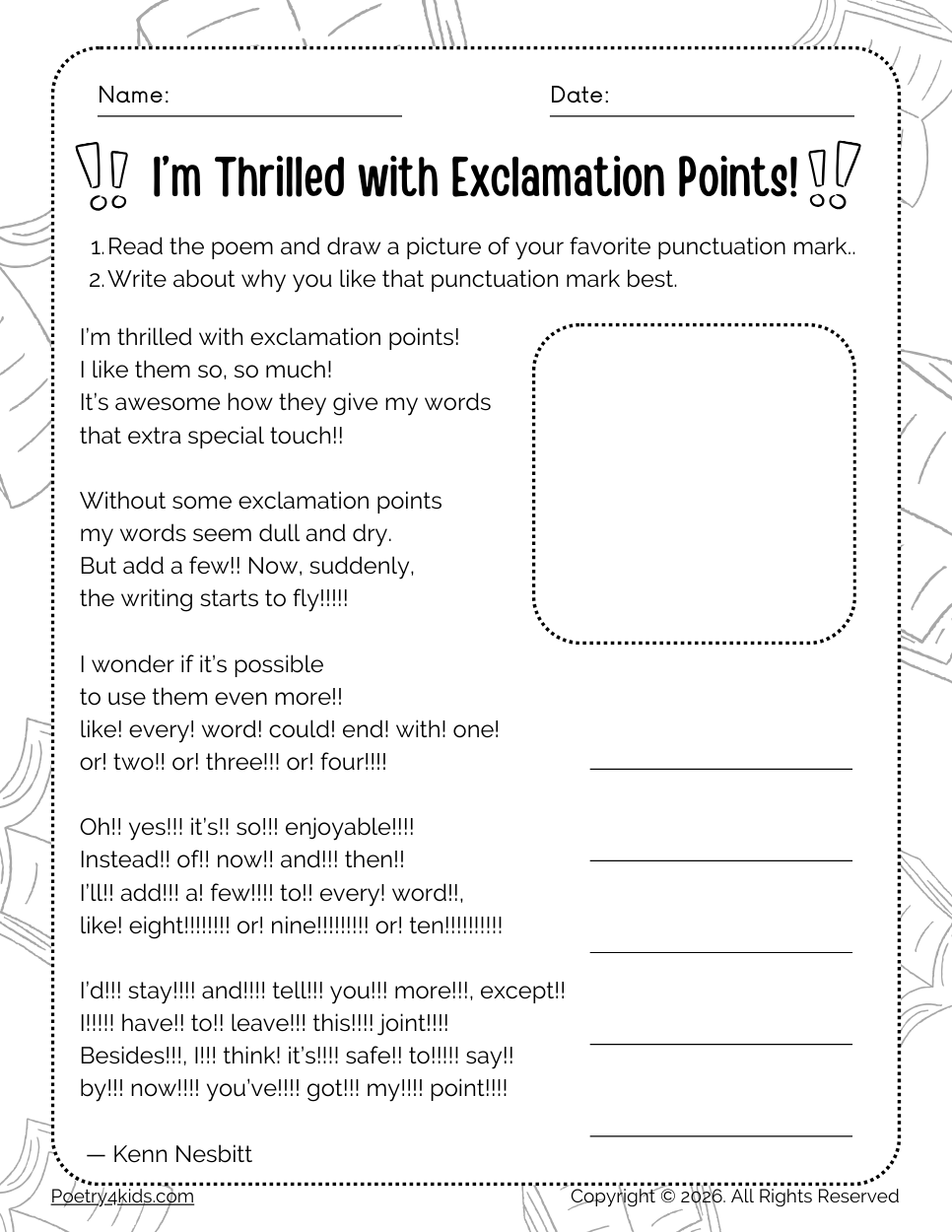 While I was thinking about other punctuation marks I might work into a poem someday—commas, question marks, slashes, brackets, and so on—it suddenly occurred to me that I’d somehow skipped the most obvious one of all. Exclamation points! They’re loud, they’re enthusiastic, and they have a way of making everything feel more exciting… sometimes a little too exciting.